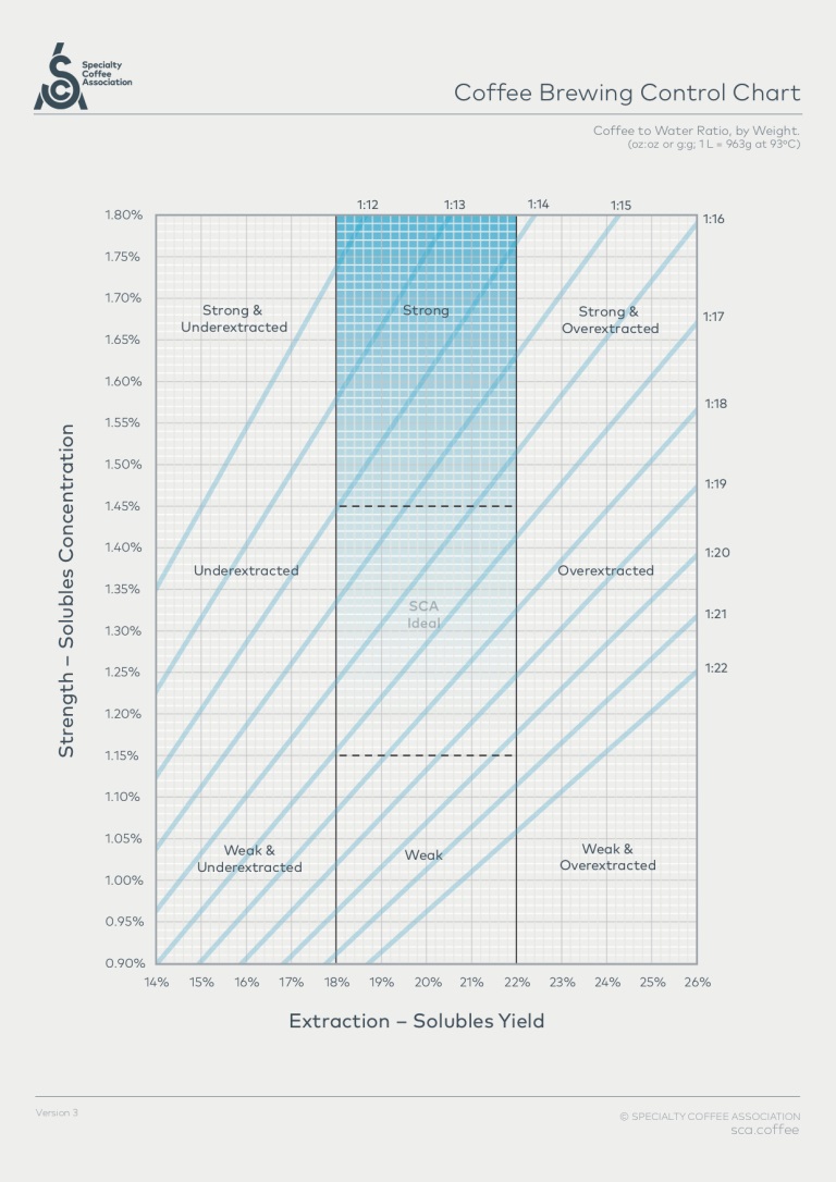 這一比例之所以格外重要,是因為它在很大程度上決定了咖啡最終釋放出來的風味組合。確定這一點的關鍵在於了解SCA提供的沖煮控制圖表。